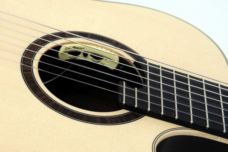 Indian Rosewood with great selectivity in the trebles as well as a top made of Alpine Spruce fit well to the sound concept of this Crossover. At the customer's request, the top is of selected mastergrade quality to optimally support the artist's soloistic ambitions. Galli- stringsOpens in a new window for the first six and FisomaOpens in a new window for the seventh string support the sound concept, the L. R. Baggs Anthem pickup is intended for live performances, while microphonic pickup is planned for the studio.