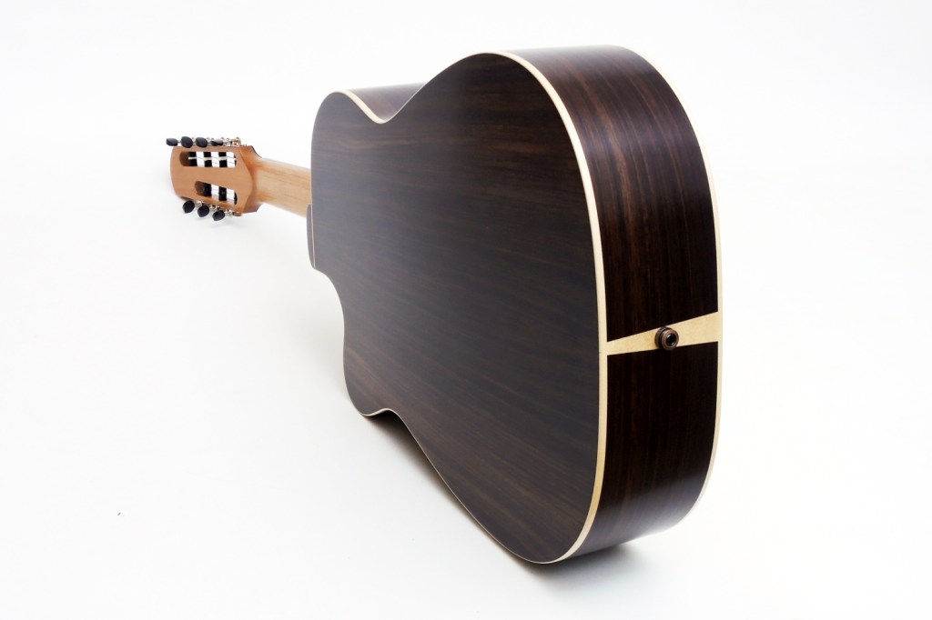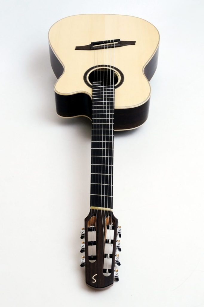 The preferred musical style of our customer is jazz in the most general sense. Requirements for the guitar were solo, but also rhythmic playing and a playability that goes towards electric guitars. Also important was playing in high registers and the corresponding excellent sound quality in this frequency spectrum, which also had to be presentable with a microphone during studio recordings. The preferred sound was nylon with an extended bass range.