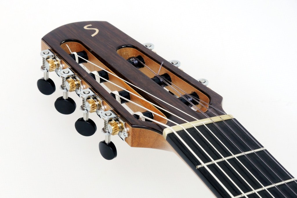 Our customer, unlike most others, plays the low string tuned to A, which sounds very good due to the extended scale length of 67 cm. A second nut was made for an alternative Gambale tuning, that is, the seventh string is the low A, then the four middle strings of the normal 6-string guitar, A, D, G and B, the latter being tuned to C. E and A follow, but not, as one might think, higher than C, but these two strings are tuned one octave lower. This is probably the first nylon string guitar with a Gambale string set.