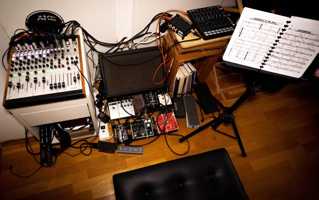 The pedalboard features 1.) electric chain: amp modeler → switcher → volume pedal → guitar synthesizer 1 → guitar synthesizer 2 + pedal (with extra out to mixer) → delay unit → reverb and 2.) DI for nylon string guitar → switcher → rest of chain like above (usually only used live). The piano chair can be seen at the bottom. The booth is shielded in all directions, so that room information is only applied digitally using a very good reverb.