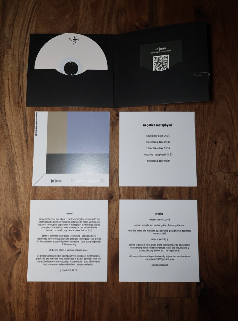 on "negative metaphysik", jena proves even more ambitious. central to the album is the title track, which runs to almost a quarter of an hour. it is an electroacoustic piece for nine guitars and just as many synthesizers (from the company "haken"). the fact that jena wishes to explore ‘the topic of biomimetics and the principle of non-identity’ may be interesting as background knowledge, but is irrelevant to the perception of the music itself. what might sound like lavish orchestration given the accumulation of eighteen instruments turns out to be an extremely restrained exercise in the shifting of pitches, almost a meditative construction.